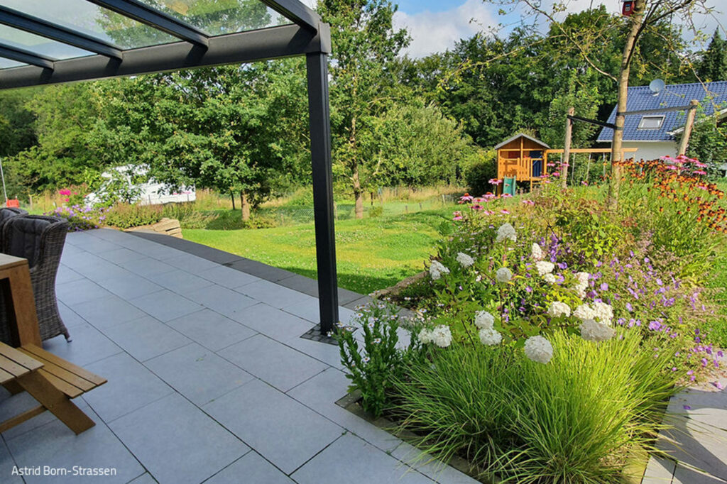 Damit die Familie gemeinsam im Garten verweilen kann, haben wir direkt neben der Orangerie einen Sitzplatz mit Holzdeck errichtet. In wunderschöner Atmosphäre können die Bewohner nun Zeit in ihrem Garten verbringen. Der Sitzplatz ist ein Blickfang, der eine warme und gemütliche Wirkung hat – perfekt für einen entspannten Abend mit der Familie!